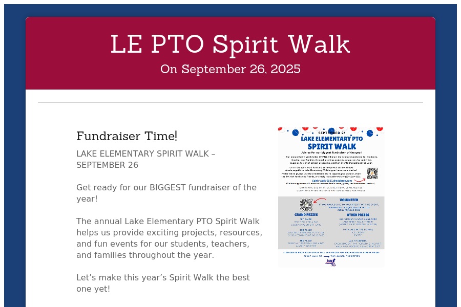 LE PTO Spirit Walk On September 26, 2025 Fundraiser Time! LAKE ELEMENTARY SPIRIT WALK SEPTEMBER 26 Get ready for our BIGGEST fundraiser of the . . .